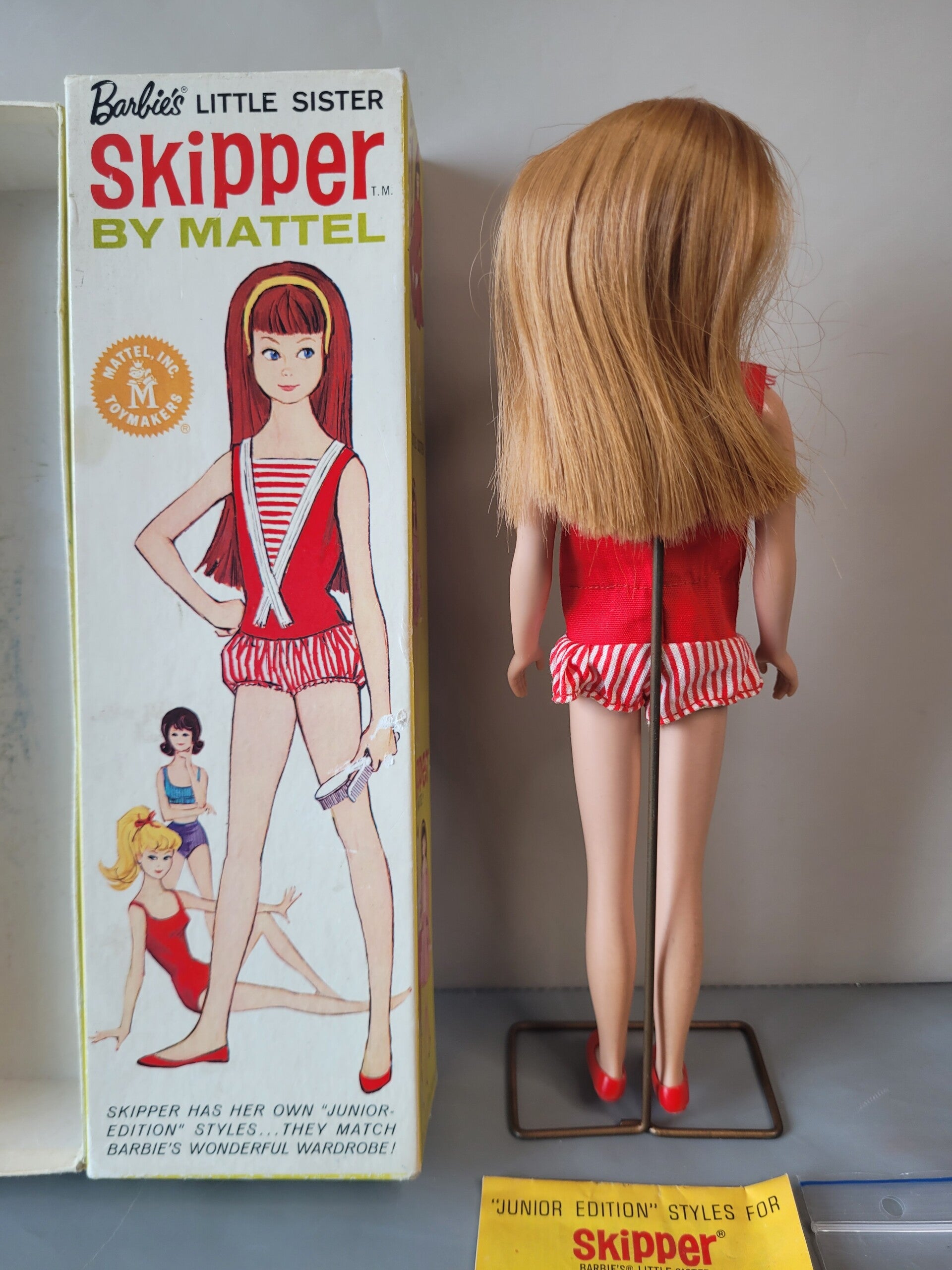 Vintage Skipper in original box Redhead, in swimsuit with stand, metal headband and booklet. The whole is in beautiful condition. Box has 1 loose corner