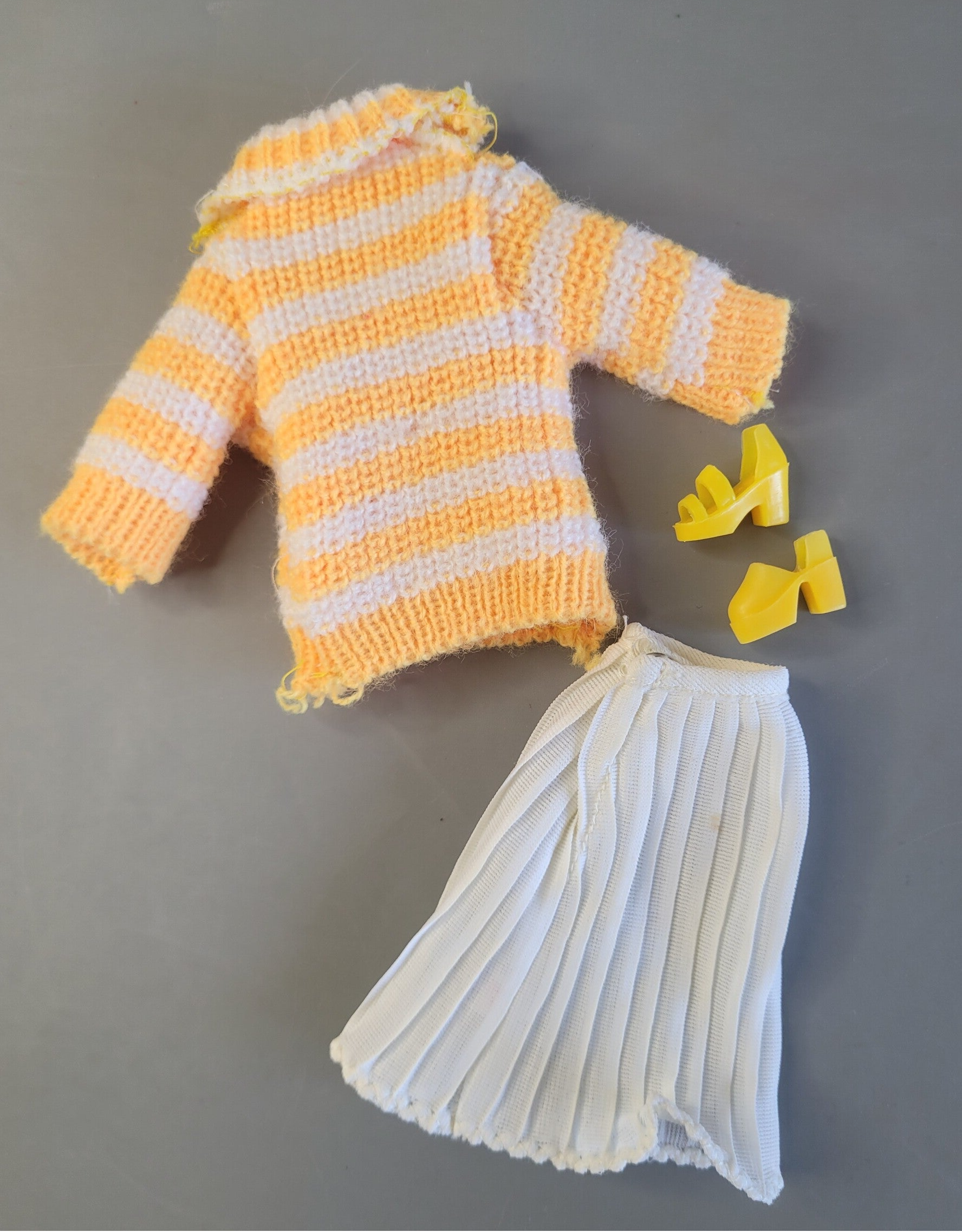 White/yellow striped knitted sweater with white pleated skirt and yellow shoes. / In good condition