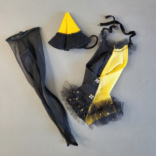 Part of the Masquerade clothing set: Black and yellow halter suit, clown hat and black tights. All in good condition