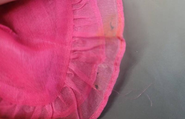 The dress and pink shawl/wrap have a few small holes and a stain on the side. Otherwise, the dress and shawl are still in good condition.