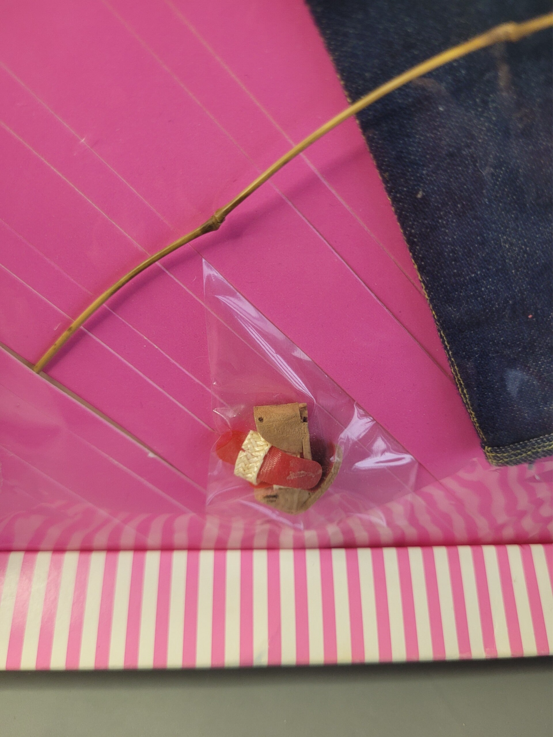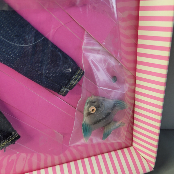 Original and complete vintage set with the HTF fish on a line with a weight and rod. The red insole of the cork wedges appears to need regluing. I've never opened them. In near-mint condition, repackaged. (Barbara Peterson / USA)